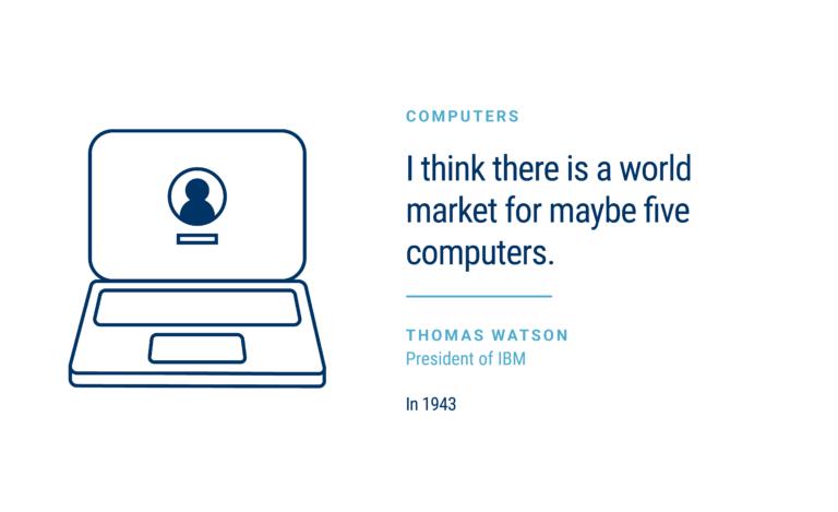 这也许是最著名也最失败的预测,那些在前个人电脑时代取得巨大成功的大型机和企业计算机高管们对于自己将成为微软、英特尔和其他个人电脑巨头成功基石的说法不屑一顾,他们无法想象“办公室里每一张桌子都有一台电脑,每一个家庭都有一台电脑”的场景。