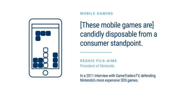 任天堂总裁Reggie Fils-Aime在2011年的讲话中表示,这些手机游戏“对于消费者来说是一次性产品。”