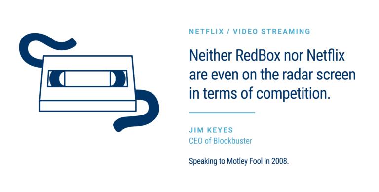 视频流服务公司Netflix对以邮寄DVD服务为核心的百视达(Blockbuster)公司造成潜在威胁。它不仅打败了视频租赁行业,现在又将目光投放到广播电视上。而这两个行业的领头人曾经都不愿承认Netflix是真正的威胁者。