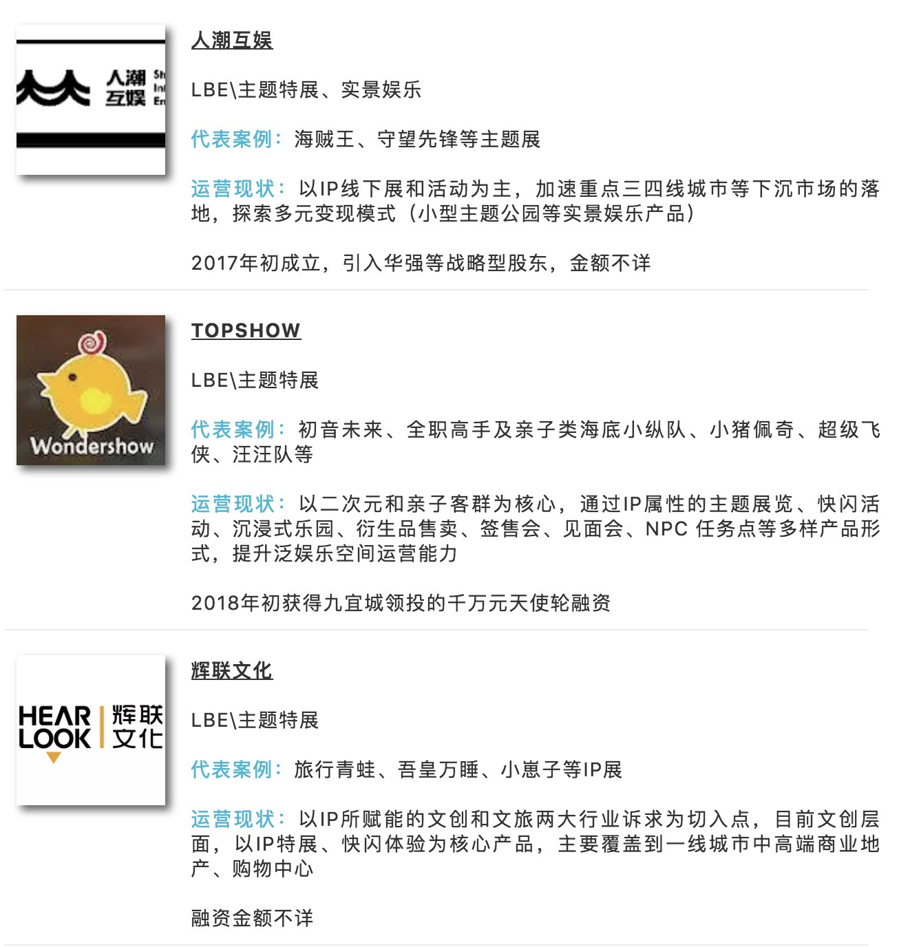 主要企业代表有辉联文化、人潮互娱、TOPSHOW、筑梦文化等。
