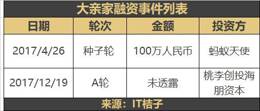 IT 桔子数据显示,大亲家至今获得过两轮融资,两轮融资均是在 2017 年完成。