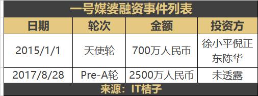 IT 桔子数据显示,一号媒婆至今完成 2 轮融资,天使轮融资于 2015 年完成,知名天使投资人徐小平参与投资。