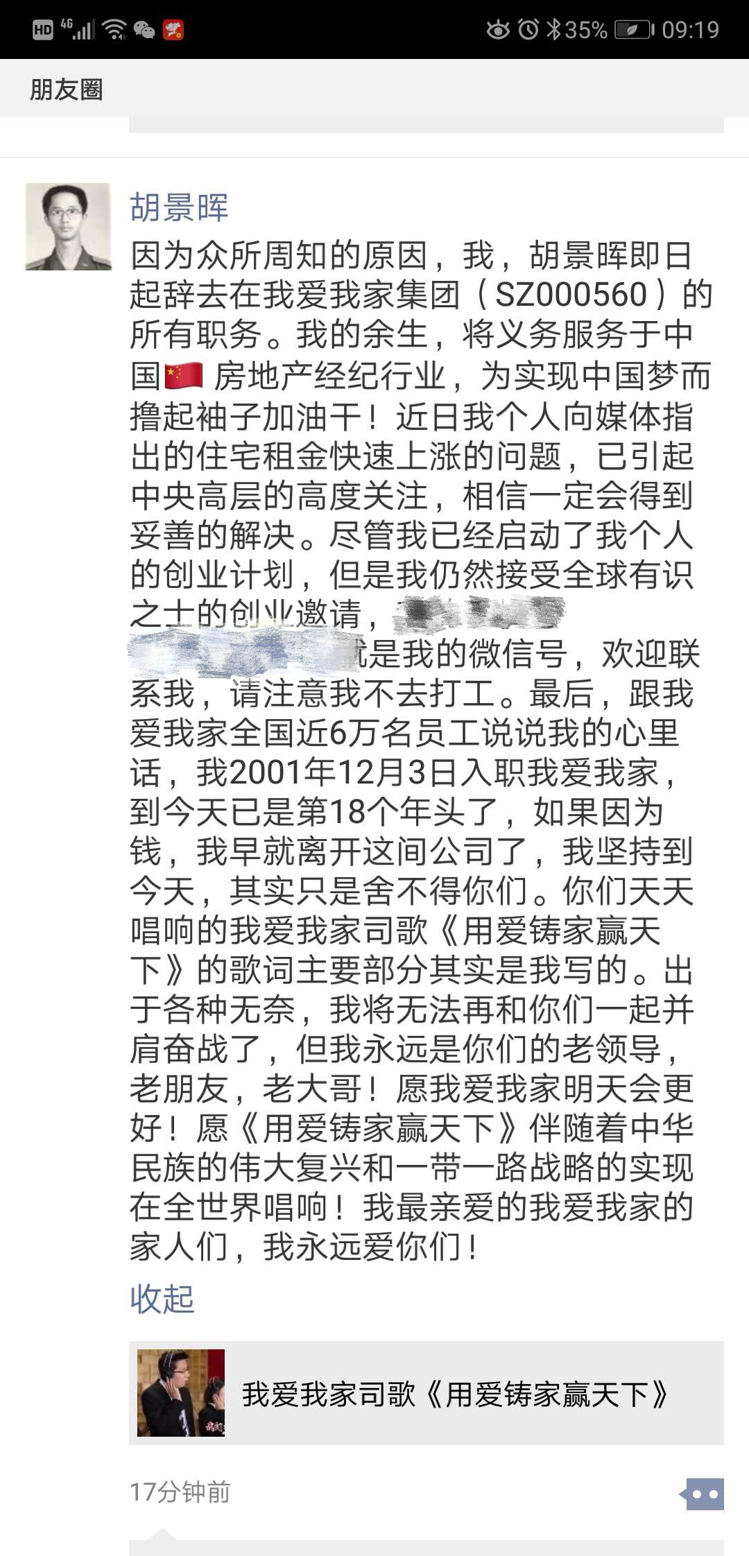 在炮轰自如推高租房租金之后的第二天,8月18日早9点,我爱我家副总裁、我爱我家集团研究院院长胡景晖就在朋友圈发布了离职消息。胡景晖在接受36氪作者采访时称,在遭到炮轰之后,链家董事长左晖直接打电话给了我爱我家集团董事长谢勇,让后者管好胡景晖,不然链家会向我爱我家全面开战,随后我爱我家调整了胡景晖的权限,禁止他代表公司发声,并不再负责公司品牌事务。