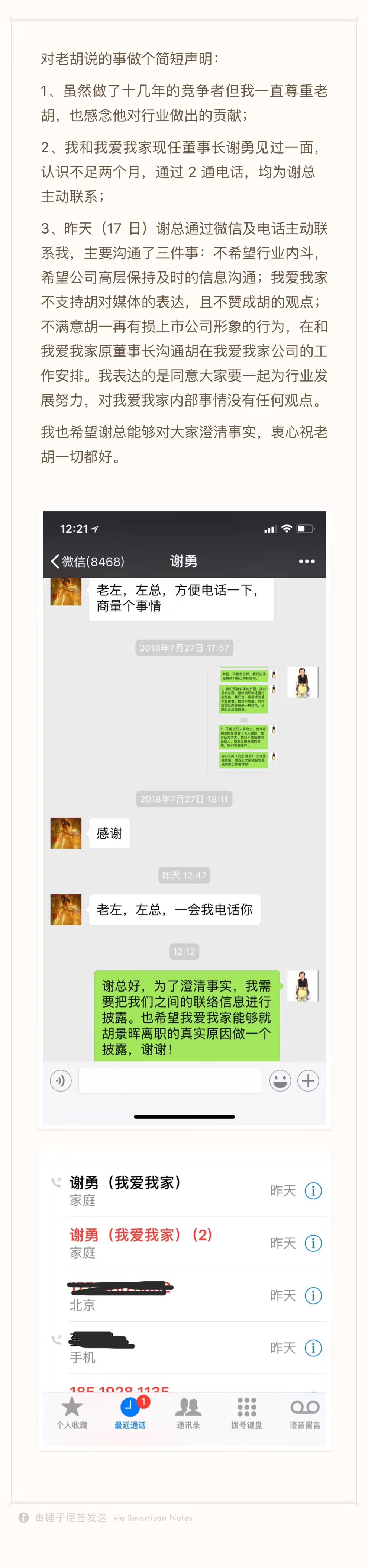 不过,随后左晖出面澄清称,电话是谢勇主动打给他的,“昨天(17日)谢总通过微信及电话主动联系我,主要沟通了三件事:不希望行业内斗,希望公司高层保持及时的信息沟通;我爱我家不支持胡对媒体的表达,且不赞成胡的观点;不满意胡一再有损上市公司形象的行为,在和我爱我家原董事长沟通胡在我爱我家公司的工作安排。我表达的是同意大家要一起为行业发展努力,对我爱我家内部事情没有任何观点。”