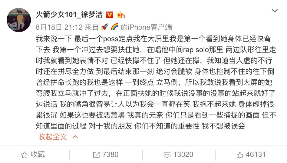 18日晚间9点12分,徐梦洁在自己的官方微博发表声明称,最后一个poss定点自己是第一个看到Sunnee身体快弯下去的,也是第一个冲过去想要扶住她的人。“如果这也要被恶意黑,我真的无奈……”无论这样的言论是不是Sunnee的唯粉发出的,但显然“火箭少女”每一个可能包含矛盾、不合、解散、分崩离析的蛛丝马迹都在被人观察着。