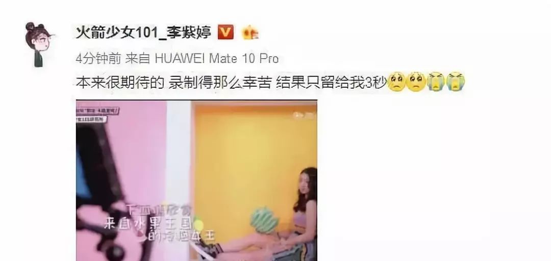 前不久,同样传出因高强度训练和工作而出现身体不适的李紫婷就曾发微博,抱怨自己在新歌MV中的镜头少:“本来很期待的,录制得那么幸苦,结果只留给我3秒。”后配一张女团为电影《西虹市首富》演唱的插曲,也是火箭少女成团后的首支单曲《卡路里》MV的截图。虽然李紫婷秒删了此条消息,但她随后仍点赞了网友为自己鸣不平的微博。她和Sunnee都明白,自己在团队中的每一秒镜头、每一次在公开场合的机会都是多么的宝贵。