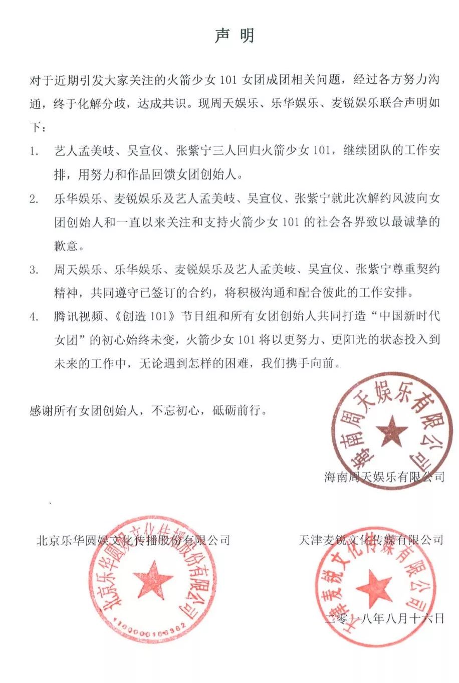 值得注意的是在周天娱乐、乐华娱乐、麦锐娱乐的联合声明中,并未再提到这两年的经纪问题。只表示:“周天娱乐、乐华娱乐、麦锐娱乐及艺人孟美岐、吴宣仪、张紫宁尊重契约精神,共同遵守已签订的合约,将积极沟通和配合彼此的工作安排。”最后一句尤其值得玩味,在此之前双方矛盾不可调和的点便在于是否施行“共享经纪”。由此看来,此次“和解”,究竟是哪一方妥协还不得而知。