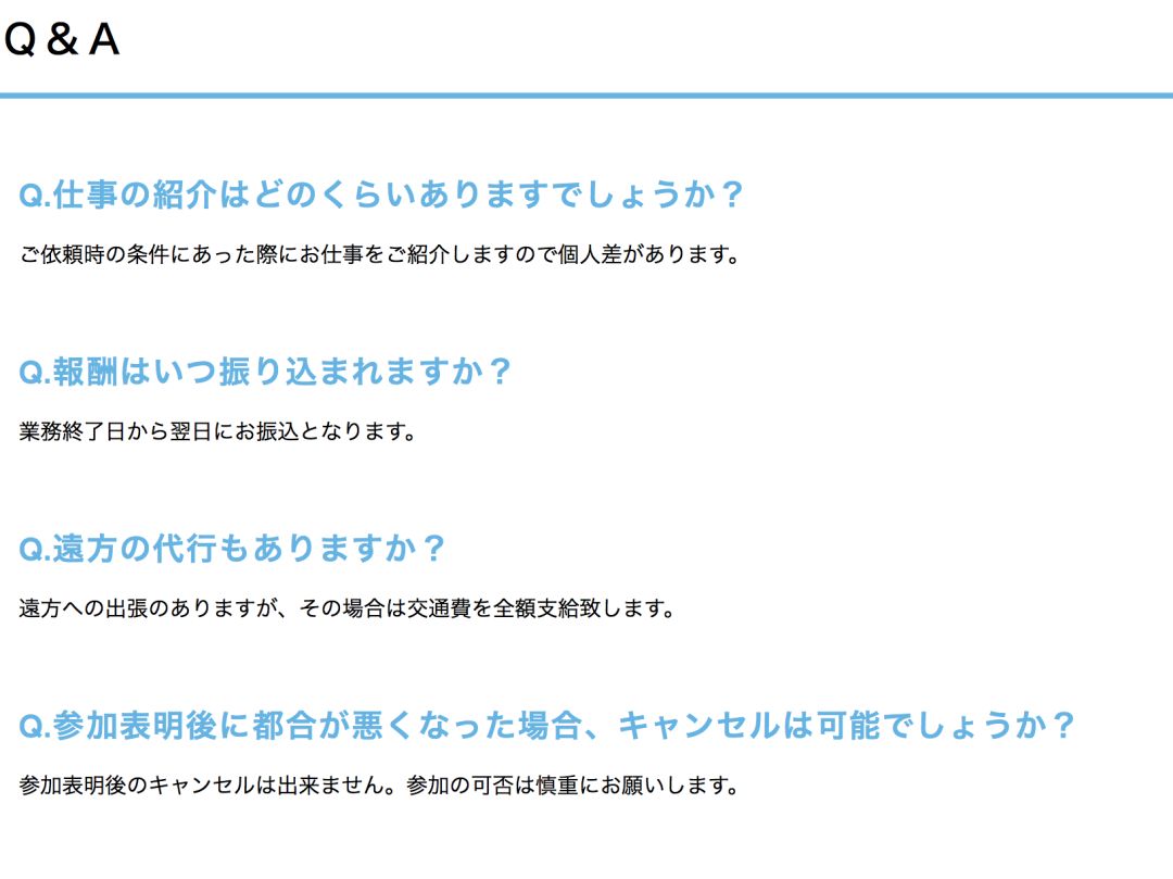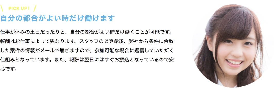可以在周末或者自己觉得合适的时候工作。报酬由工作内容决定。弊社会将合适的委托单情报以邮件的形式发送给已注册员工,员工选择能够参加的案子进行回信。报酬会在次日进行发放,大可放心。