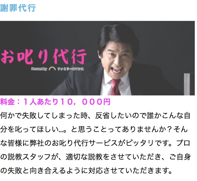 当然,除了租赁以上能带来温暖、排解寂寞的角色。在日本这个最爱说对不起的国家,自然少不了替人挨骂服务。
