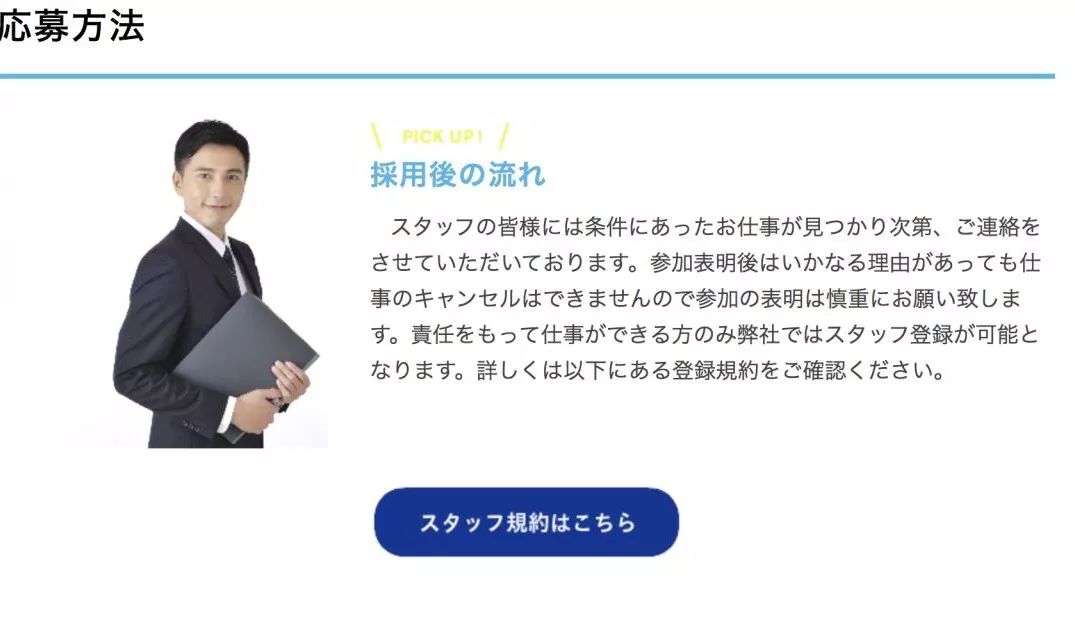 会根据是否有适合的工作来对员工进行联络。决定参加之后,无论有什么样的理由都不可以取消,因此请一定要慎重决断。只有带着责任感去工作的人才有可能成功注册为弊社的员工。详细情况请在下面的注册规章中查看。