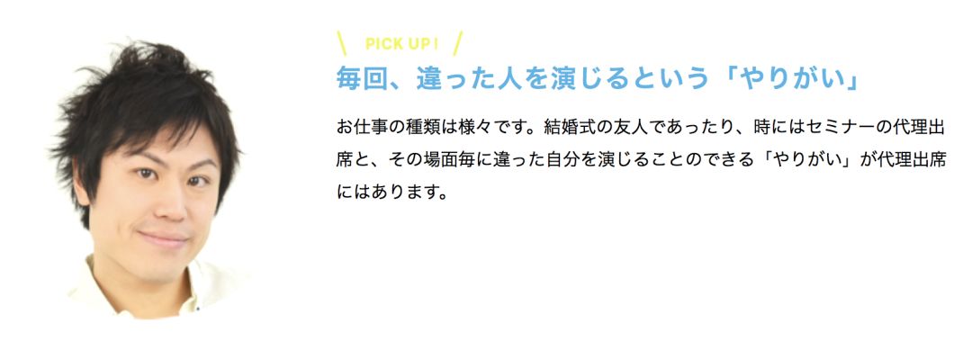工作的种类多种多样。有时是结婚典礼上的朋友,有时是研讨会的代理参加人,场合不同,每次的自己也都是不同的人。代理出席可以给你这样的「价值」。