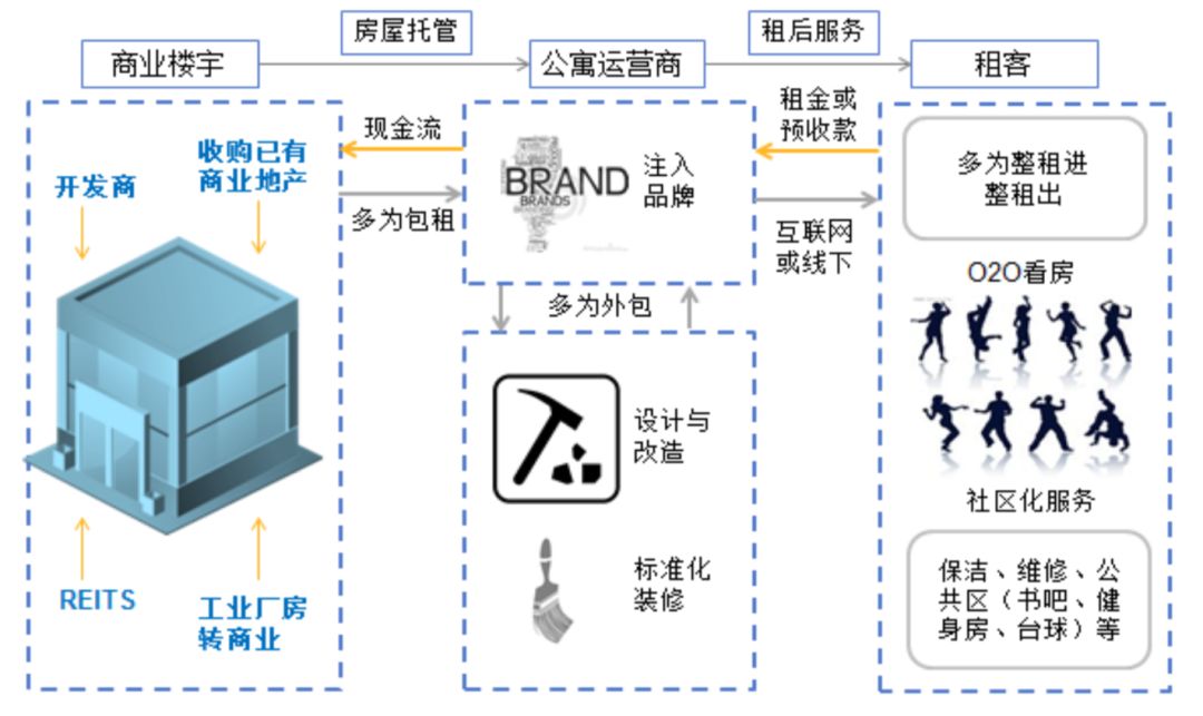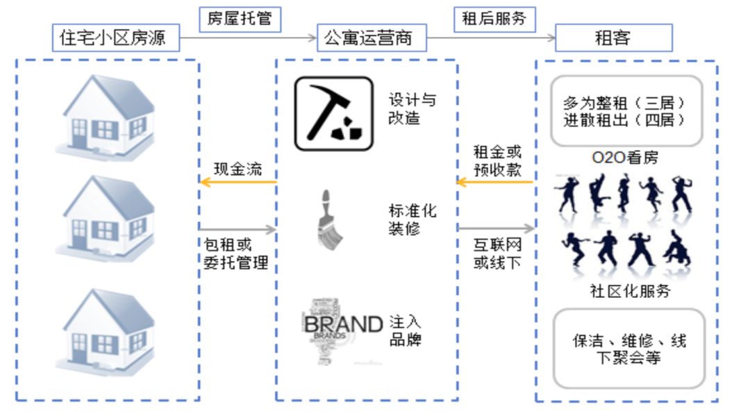 分布式长租模式起步较晚,模式相对而言比较单一:从分布的房东手里取得房屋,通过房屋包租运营,标准化的服务与改造,提供整体的资产管理解决方案,解决刚需用户的租住需求。