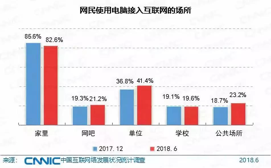 同样,我国网民在家里通过电脑接入互联网的比例为82.6%,与2017年末相比降低了3.0个百分点;在网吧、单位、学校、公共场所通过电脑接入互联网的比例分别增长了2.0、4.6、0.5、4.5个百分点。在上网时长方面,2018年6月,中国网民的人均周上网时长为27.7小时,相比2017年末提高0.7个小时。