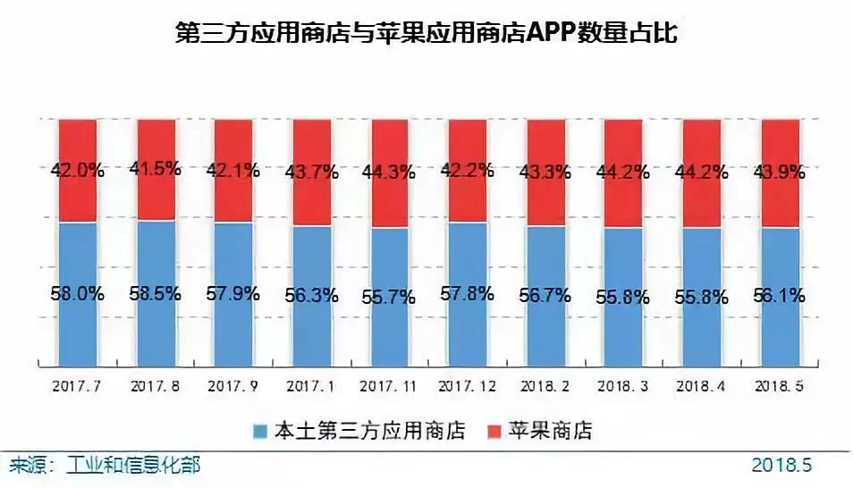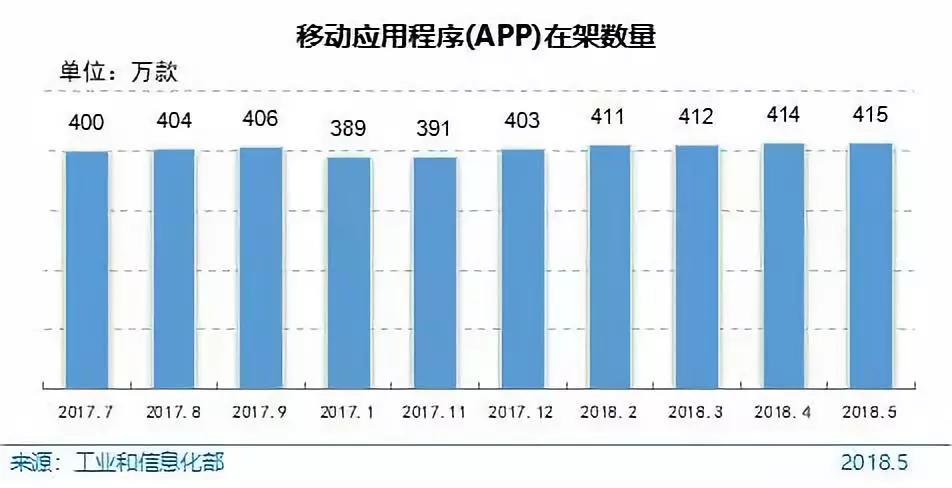 截至2018年5月,我国市场上监测到的移动应用程序(app)在架数量为415万款。其中,我国本土第三方应用商店移动应用数量超过233万款,占比为56.1%;苹果商店(中国区)移动应用数量超过182万款,占比为43.9%。截至2018年5月,游戏类应用一直占较大比例,数量超过152万款,占比达36.6%;生活服务类应用规模位于第二,超过56.3万款,占比为13.6%;电子商务类应用规模位于第三,超过41.6万款,占比为10.0%。