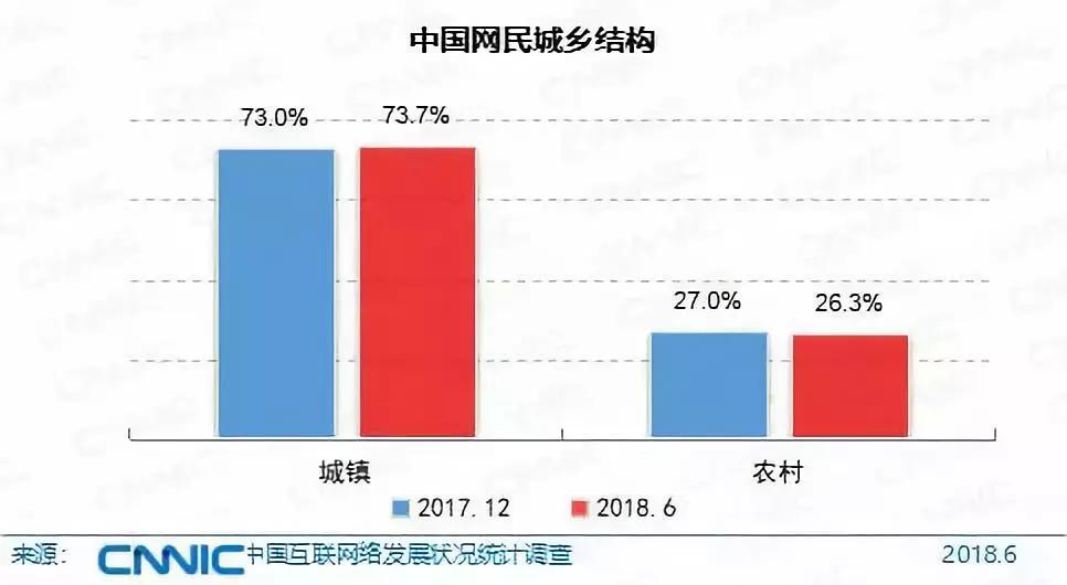 截至2018年6月,我国农村网民占比为26.3%,规模为2.11亿,较2017年末增加1.0%;城镇网民占比73.7%,规模为5.91亿,较2017年末增加4.9%。