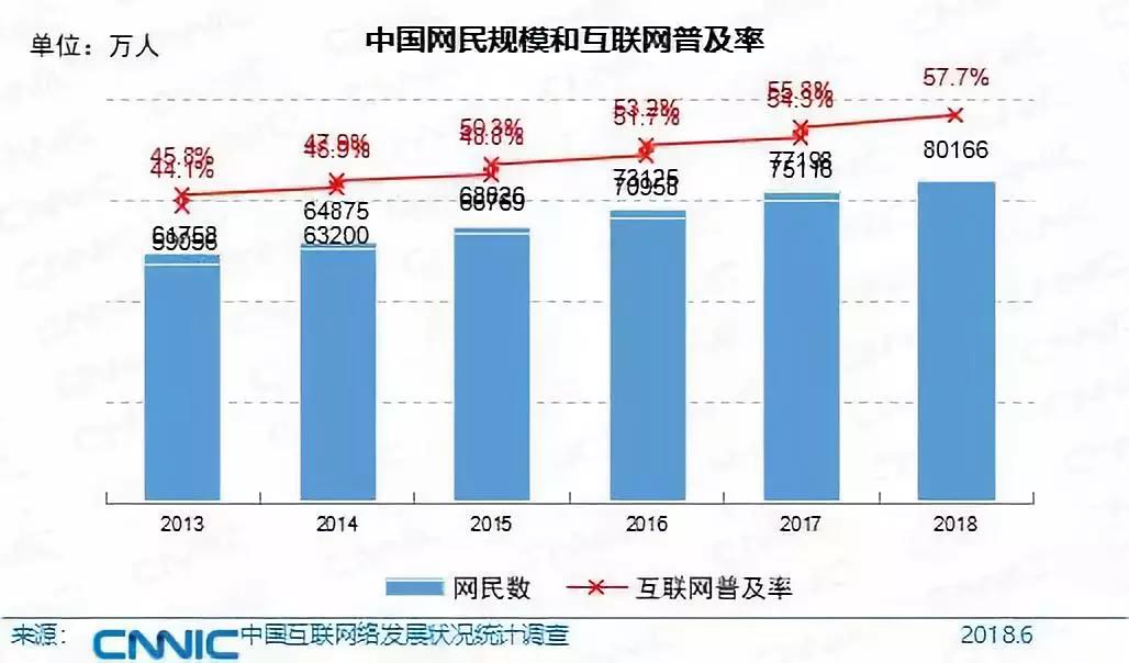 截至2018年6月,我国网民规模为8.02亿,上半年新增网民2968万人,较2017年末增加3.8%,互联网普及率达57.7%。