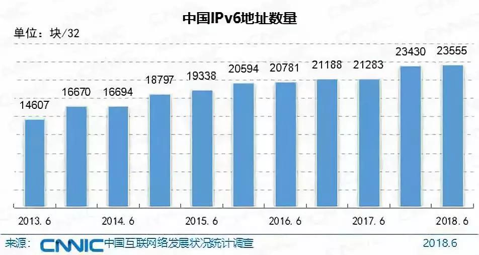 截至2018年6月,我国IPv6地址数量为23555块/32,半年增长0.53%。