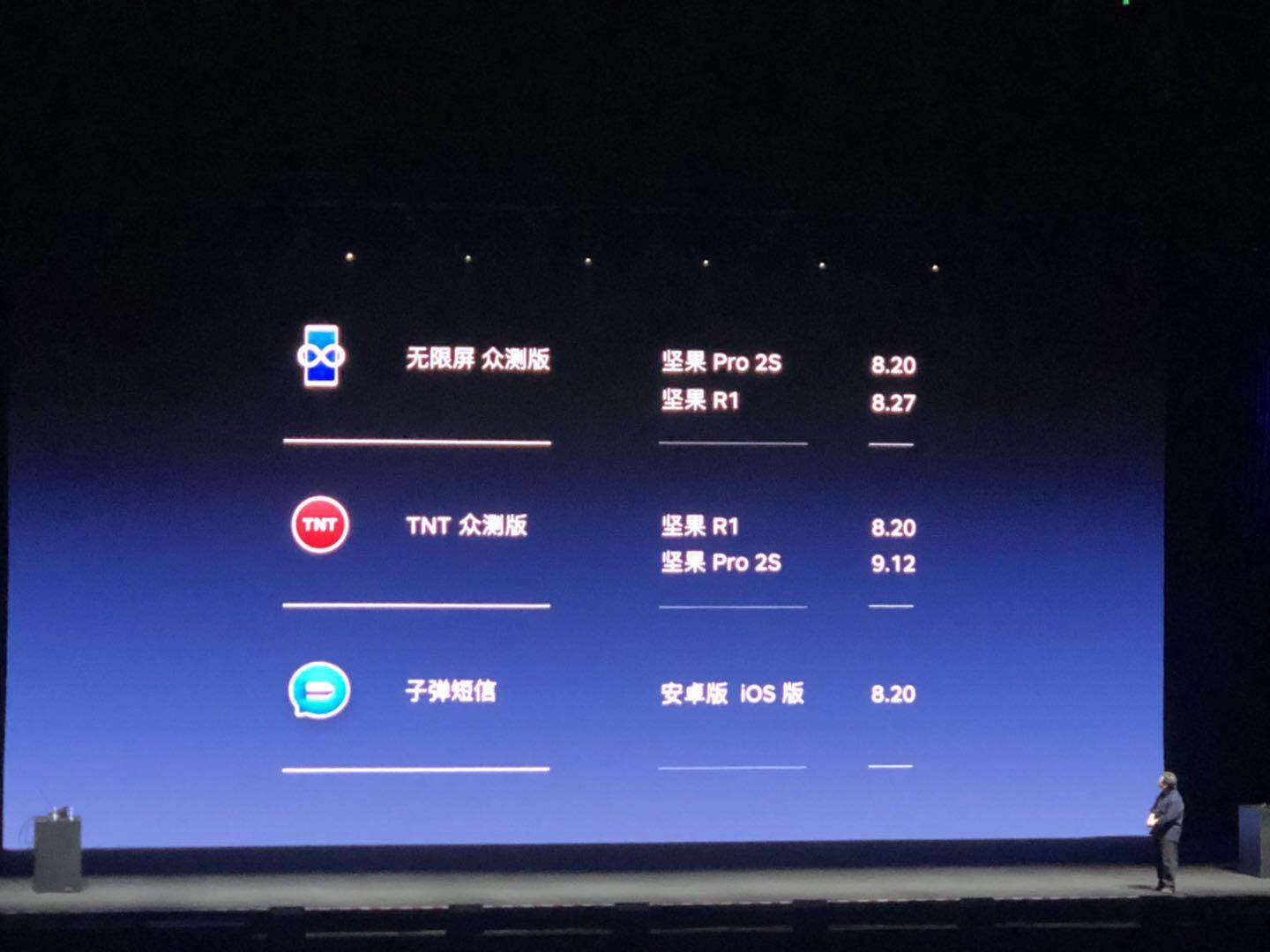无限屏众测版:坚果Pro 2S,坚果R1的下载时间分别为8月20日和8月27日。