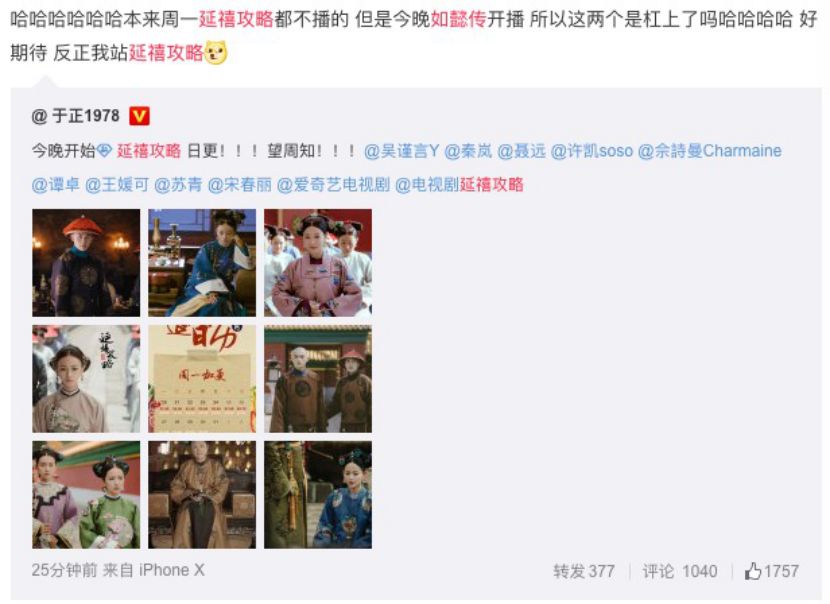 时势造英雄,是更古不变的真理。放在一个月前,没有人会将《延禧攻略》和《如懿传》相提并论,因为“不够格”;随着《延禧攻略》先发制人燃爆舆论,两者的对比便难以避免,再加之今早《延禧攻略》宣布日更,战斗再次升级!究竟是先入为主,还是后发制人呢?