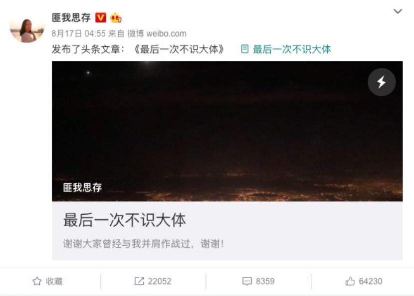2017年8月,匪我思存在网络上发难指责《如懿传》抄袭,并甩出了多张截图例证,引发无数网友支持。即使是如今,抄袭丑闻仍未落幕。就在8月16日,刚刚宣布定档当晚凌晨,匪我思存再次发文:最后一次不识大体,再指抄袭!文章首发平台微信公众号以2.4万阅读撬动3628人点赞支持;微博点赞数6.4万,转评人数3万余。