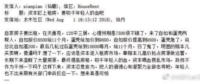 前不久,北京天通苑一业主在某社区论坛发贴称:自己家的房子要出租,心理预期价位是7500元/月,到自如和蛋壳公寓两家公司询问后,却被两方拼命争抢,最终蛋壳给到10800元每月的价格,付11个月。顿时舆论哗然。