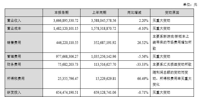 报告期内,完美世界游戏发布的新游势头很猛,比如《武林外传手游》不到一天流水破千万,《烈火如歌》上线1个月流水破亿…...游戏产品带来良好收益的同时,也吸收了大批年轻用户和女性用户。当然在这背后,也伴随着市场费用的大幅攀升,报告显示,上半年销售费用为4.46亿元,同比增加了26.52%,主要系新游戏、新版本上线带来的市场费用增加所致。