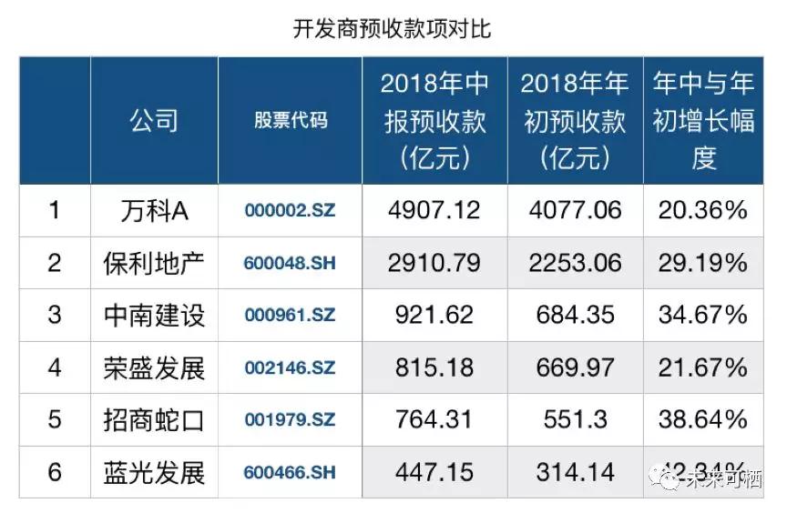 跟自己比也是一样。据 2017 年年报显示,2017 年年末,万科实现了 4077 亿元预收款项,同比增长了 48.45% 。2017 年年中,万科实现 3579.31 亿元预收款项,与年初相比增长了 30.32% 。而 2018 年中,万科预收款项仅增加了 853.83 亿元,与年初相比涨幅也仅有 20% 。