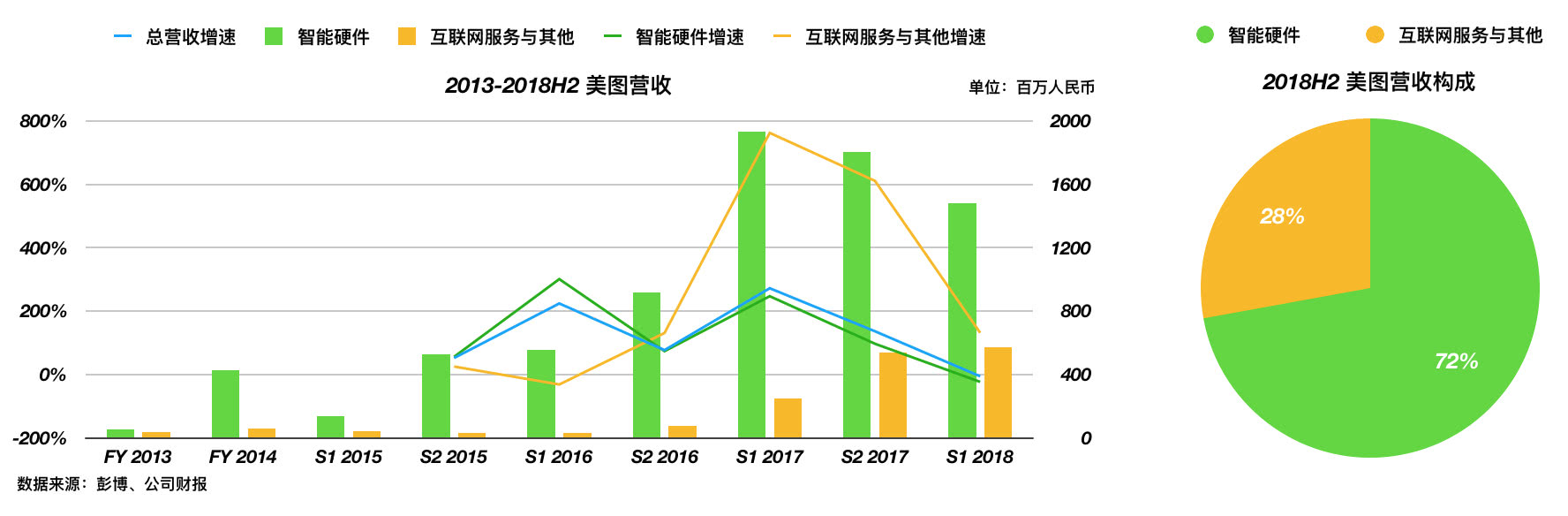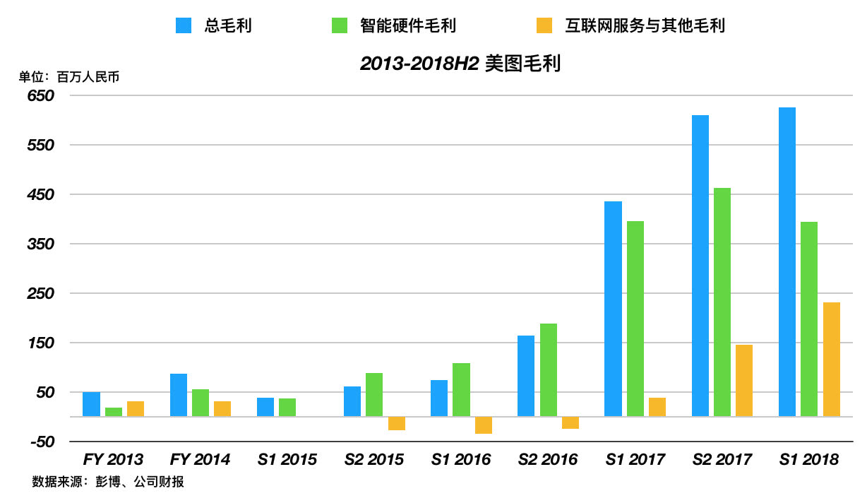 互联网营收是美图秀秀、美拍、美颜相机这系列app带来的,广告收入为主,还有一些增值服务收入。而硬件就是美图出的手机,值得一提的是,因为品牌溢价,美图手机的毛利率比同行高不少。