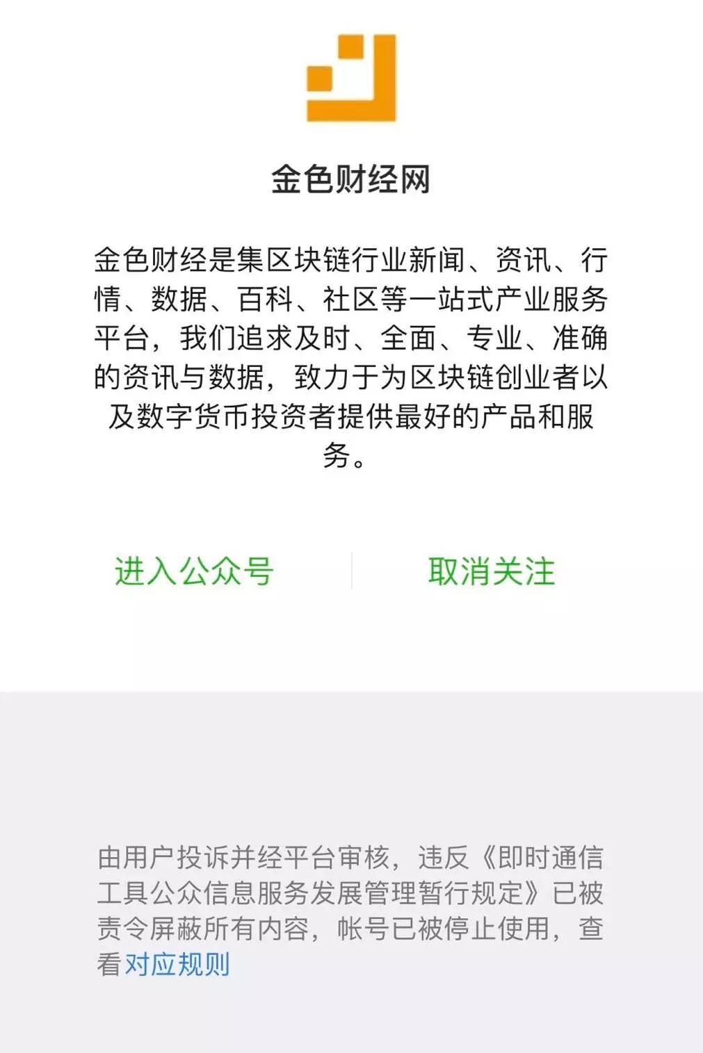 8月21日晚,不少业内人士发现,金色财经、币世界、火币资讯、深链财经等多个区块链公众号主页,均显示账号违反《即时通信工具公众信息服务发展管理暂行规定》,已被责令屏蔽所有内容并停止使用。