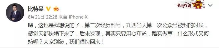 对于这次封号,某区块链大V表示是“欲加之罪何患无辞”。刚成立公司没多久的他,不想发表更多评论,只说“国家监管只会越来越严,我们能做的只有配合监管,踏踏实实做事”。至于具体怎么做,他并未多言。