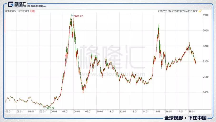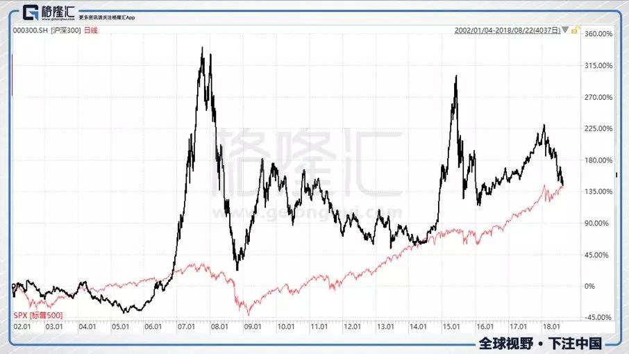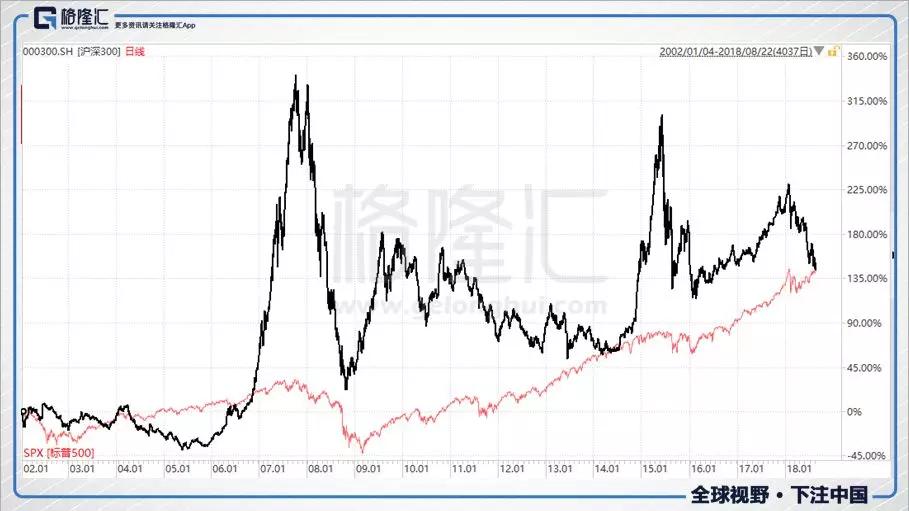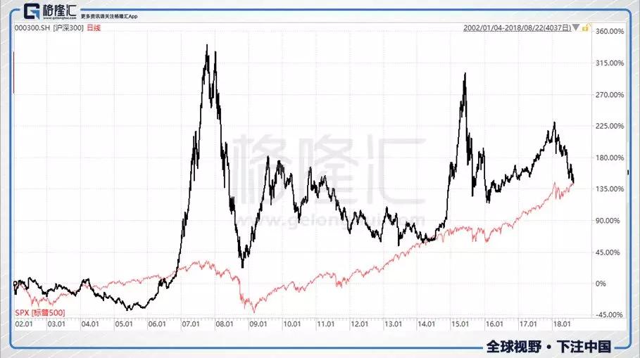 回到上面那张沪深300与标普500的趋势图,我们会称标普500是长牛,却很难称沪深300是牛市。但是请注意,从2002年1月到2018年8月,沪深300的涨幅其实与标普500是差不多的。