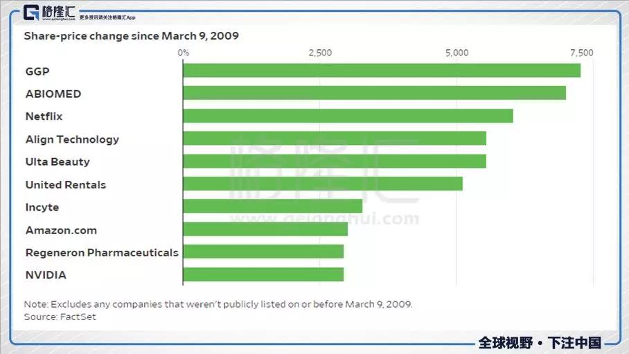 这轮金融废墟里起来的美股牛市主要由科技股推动而成,科技板块为标普500的涨幅贡献了22%的力量,仅苹果一家公司就贡献了4.1%。这轮牛市里表现最好的10家公司里大多数是科技公司: