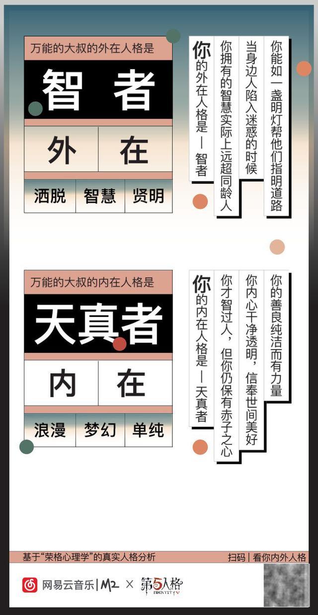网易云音乐这次的“人格测试”H5的刷屏,大叔认为核心还是优越感,比如大叔测试完,看到结果,挺开心的:大叔的外在人格是“智者”,内在是“天真者”,哇,感觉好像一个很优秀的人耶,感谢分享到朋友圈,告诉亲朋好友们。