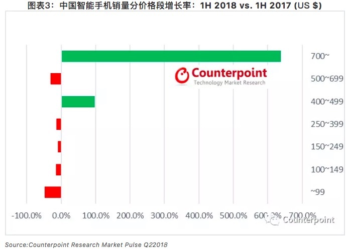 2018上半年,中国市场增长最显著的智能价格段为 “700美金以上” ,尽管苹果销量略有下滑,但iPhone X销量强劲抬高了中国智能手机市场平均售价。2017年Q4,iPhoneX全球出货2900万部,中国市场占700万部,占比24.1%;另外,荣耀10系列、小米8系列、OPPO R15系列、VIVO X21系列等手机拉动了“400-499美金”价格段的销量。