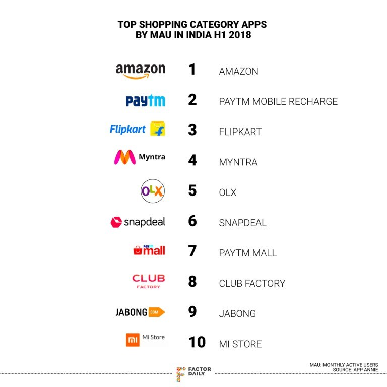 2018年上半年印度 MAU 排名前十的电商网站