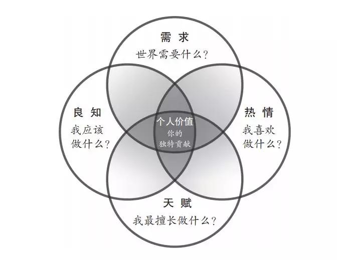 所谓个人价值,是天赋、热情、需求与良知的交集。当你的良知驱使你去努力满足社会的需求时,当你全身心投入某个能够运用你的天赋、点燃你的热情的工作时,这就是你的个人价值所在,这就是你的使命,你的“灵魂代码”。