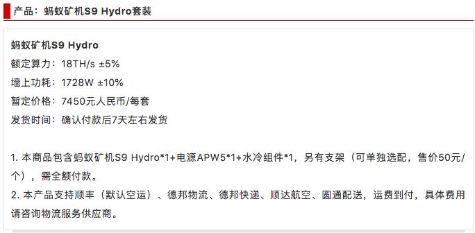 今日( 8 月 23 日),蚂蚁矿机官微宣布,水冷矿机S9 Hydro发售,暂定价格为7450元人民币/套。据悉,这是比特大陆继推出蚂蚁矿机S9i、ANTBOX和Z9mini等产品之后,本年度推出的第8款新品。