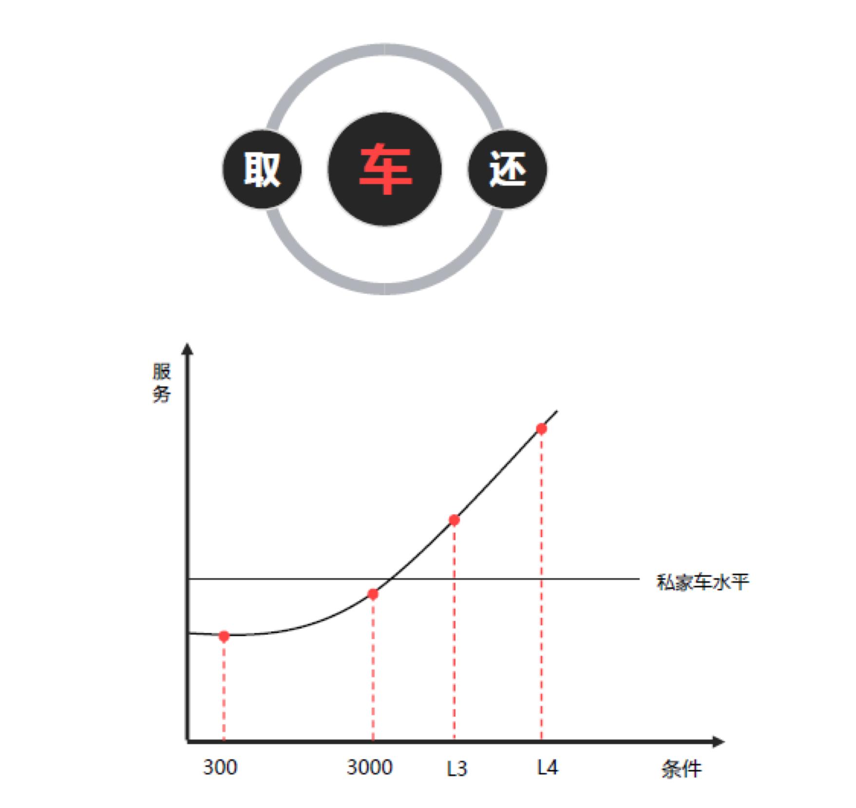 有两个坐标轴,横轴和纵轴。服务上是纵轴,横轴是条件,当你达到不同条件,提供的服务水平是不一样的。其实分两个阶段,300台车在一个城市单独投放的时候,在北京这样的城市,根本就不够。所以大家用这个车时,取还车的体验很差。