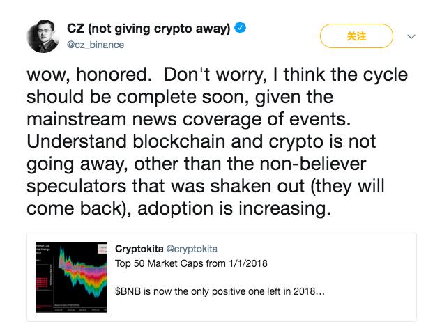 赵长鹏就发推特表示:区块链和加密不会消失,该领域的人会越来越多。他表示,“考虑到主流媒体对事件的报道,我认为周期应该很快结束。区块链和加密货币不会消失,除了那些被淘汰的非信徒投机者(他们会回来的)之外,采用区块链和加密货币的人越来越多。”