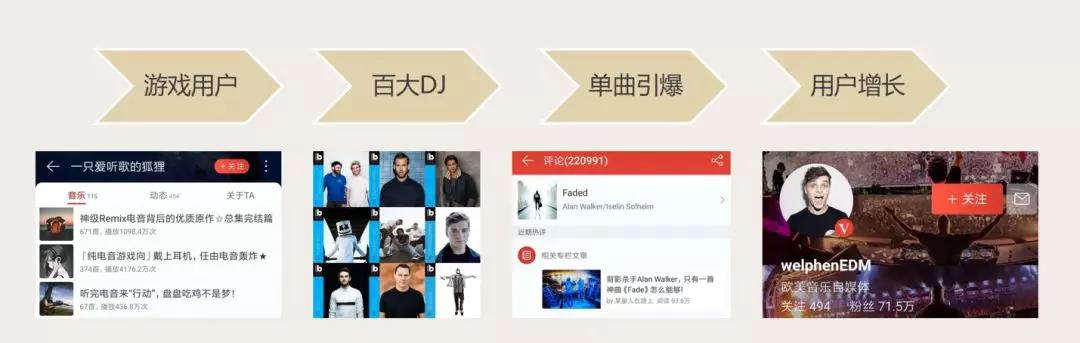 通过扩充曲库、设立电音榜、UGC 运营以及协同过滤,云音乐逐渐聚集了大部分的电音爱好者。2016 年,Alan Walker 的 Faded 进入了云音乐年度的播放和评论前三;Faded 的走红又带动了更多的用户入坑电音。
