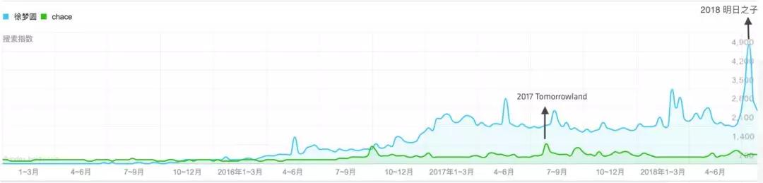 对比国内最有知名度的两位电音音乐人 Chace 和徐梦圆,前者在 2017 年登上了 Tomorrowland 的舞台,热度只是微微上涨;而后者在今年参加了《明日之子》选秀,节目播出后热度一路飙升。