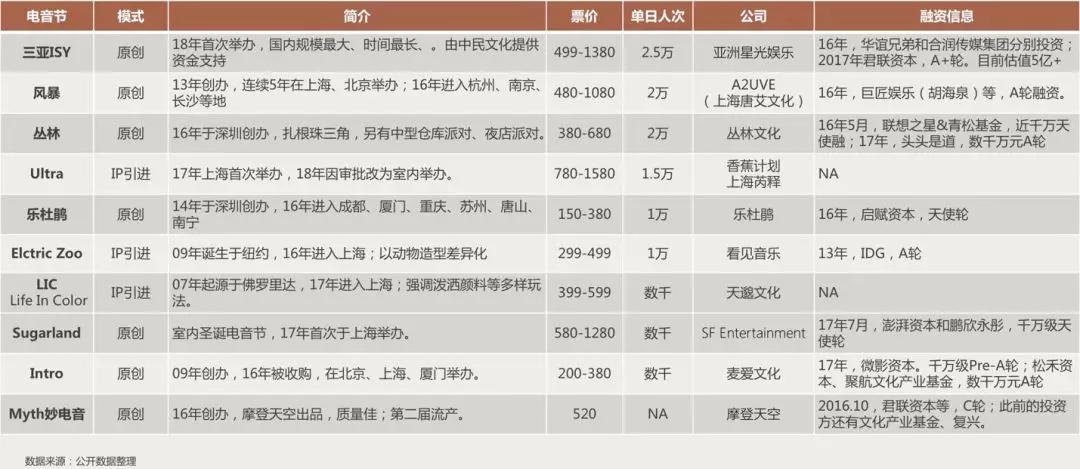从 2011 年到 2015 年,中国内地的电音演出活动总承载力增长了 3 倍;2016 年,国内举办电音节 32 场,2017 年更是超过 50 场。并且电音节的场次和规模也有变化,例如在 2013 年只有 1 场 2.5 万人次的风暴,2017 年共举办了 9 场,参与者达到 18 万人次。