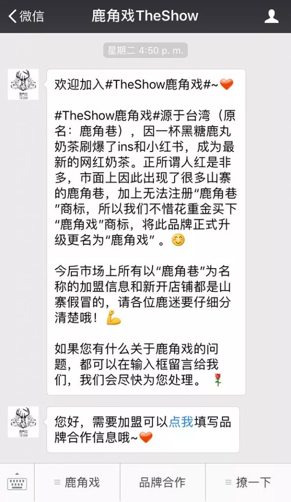 今后市场上所有以「鹿角巷」为名称的加盟信息和新开店铺都是山寨假冒的。