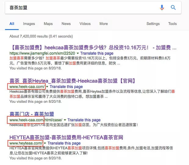 以喜茶为例,我们在 Google 以「喜茶加盟」为关键词,搜索结果第二个就是一个山寨官网,其网址只比真正的官网多了一个「a」,品牌介绍中「自开第一家店面以来,就备受青睐和关注,导致品牌名称被相继模仿,为了避免山寨产品以次充好,我们决定更换商标」一句也让人觉得颇为讽刺。