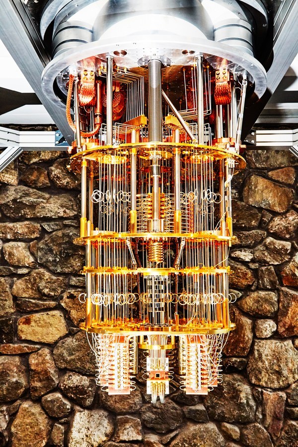 IBM的一个量子计算芯片的冷却和支持结构(图片底部的黑色小方块)。