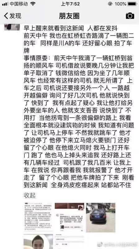在滴滴出行今日发布的公告中,“让我们万分自责的是,在该车主作案的前一天,有另一名顺风车乘客投诉其‘多次要求乘客坐到前排,开到偏僻的地方,下车后司机继续跟随了一段距离’,我们的客服承诺两小时回复但并未做到,也没有及时针对这一投诉进行调查处置,无论什么原因,我们都负有不可推卸的责任。”此处提及的乘客也发布了朋友圈,详细地记录了当时的经过: