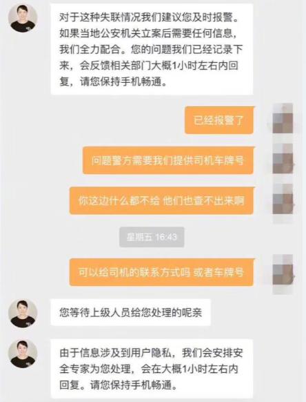 据悉,滴滴平台了解情况后建议赵某朋友报警,并称在一个小时后会有相关工作人员介入处理此事。由于没有司机和车辆的相关信息警方无法立案,赵某朋友多次向滴滴客服索要车牌号等信息,得到了“涉及用户隐私,需等待上级处理”的答复。