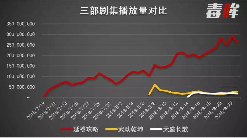 除此之外,杨洋主演的《武动乾坤》上线19天,播放量为17.5亿次,鹿晗、关晓彤主演的《甜蜜暴击》上线34天,播放量为72.7亿,唯一的惊喜是江苏卫视播出的《香蜜沉沉烬如霜》,该片收视率最高达1.208%,上线24天网播量达到69.5亿,在卫视收视榜单排名第二、网台剧网播量排名第一。尽管如此,这些剧的网播量还是与《延禧攻略》有着云泥之别。