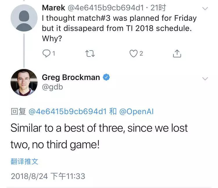 正如专注于游戏领域 AI 研究的迈克·库克在 Twitter 上所说,「机器人在即时即地的反应上做得很好,但宏观层面决策的表现却很糟糕。」Open AI 计划在当地时间周三、周四、周五连比三场,由于比赛采取三局两胜制,OpenAI 在输给中国战队之后,就结束 TI8 之旅。