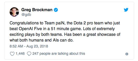 AI 在这几场比赛中所缺失的也正凸显了目前机器学习的局限性,在看似「不起眼」的策略、规划制定上,人工智能貌似还差得很远。格雷格曾在 8 月初 OpenAI Five 战胜半职业战队之后发推祝贺,「已经准备好迎战 TI8」,但是现在看来 OpenAI 在 Dota2 上要走的路还有很长。